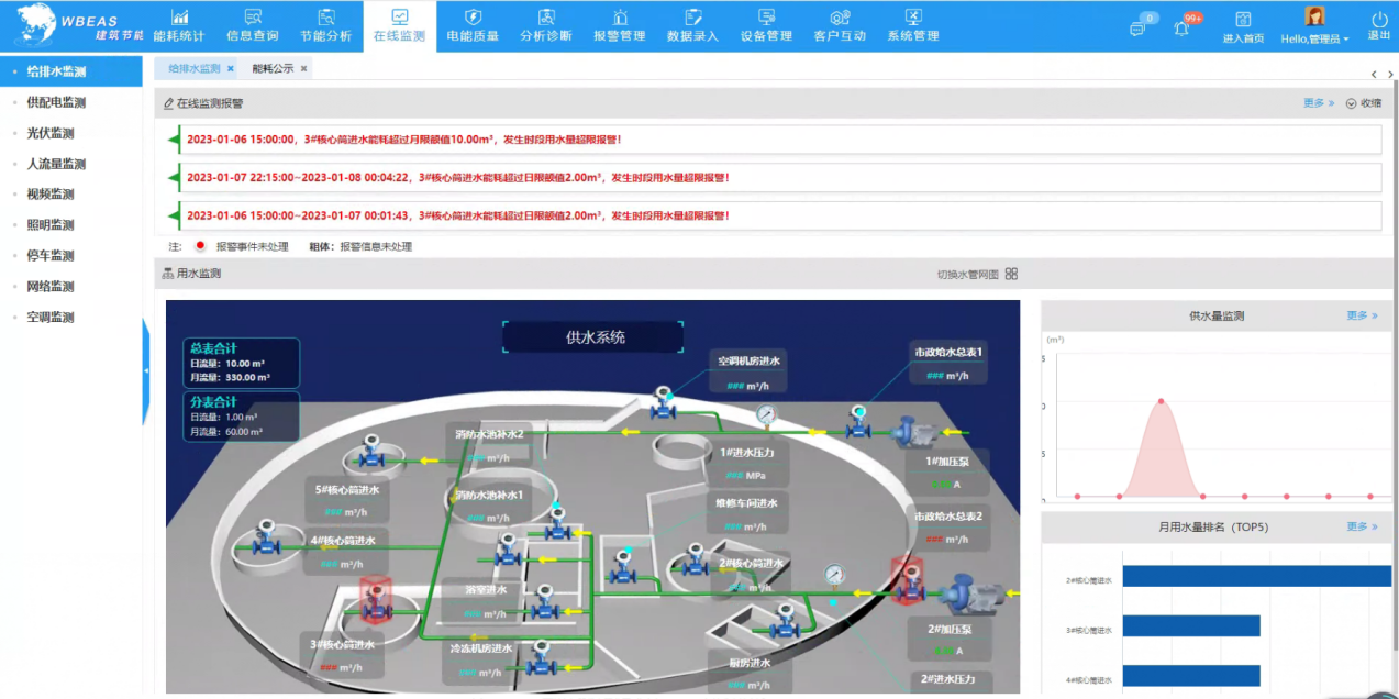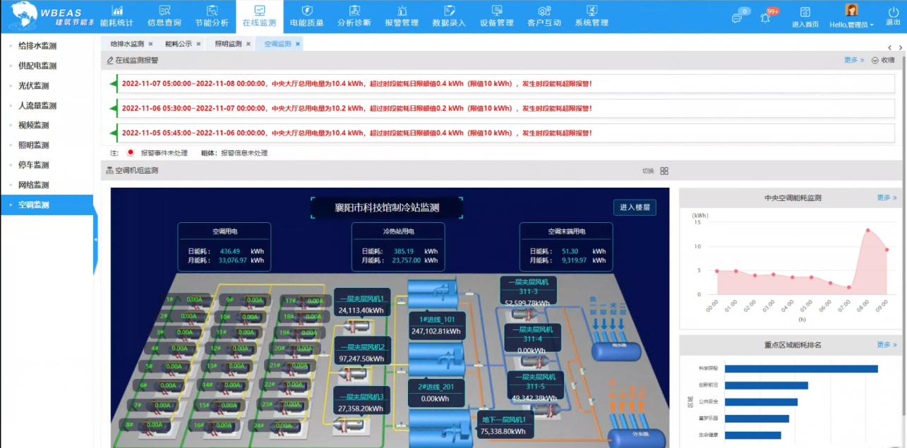 襄陽科技館展區多,建筑能源管網復雜,能源跑冒滴漏不易被及時發現,導致能源長期被浪費,WBEAS節能系統將科技館內部供水管網、制冷管網以能流圖的形式顯示用能走向,方便運維人員查看能源流向以及各級損耗情況,通過能源平衡報警,運維人員及時處理了多處地下供水管網跑冒滴漏的情況,避免用能浪費,預計一年可節約電費3萬元。