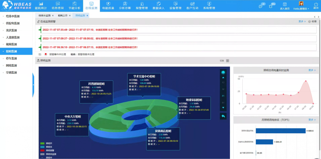 襄陽科技館新館使用了節能型LED燈具,節能效果顯著,智慧照明系統實現了公共區域照明的集中控制,但重要區域照明控制仍然依靠人工控制,無法做到根據實際需要開啟不同照明燈具,針對該情況,智能優化節能系統將重點區域照明納入統計管理,根據實際區域使用情況,對照明進行智能化控制,減少無人情況下,照明用電的浪費,通過加強對非工作時段照明的管控,預計一年可節約電費2.5萬元。