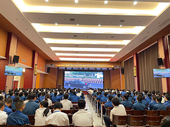 9月3日上午,萬洲電氣一樓多功能廳氣氛莊重而熱烈,萬洲集團400余名在家員工齊聚一堂,集中觀看中國人民抗日戰爭暨世界反法西斯戰爭勝利80周年現場直播。