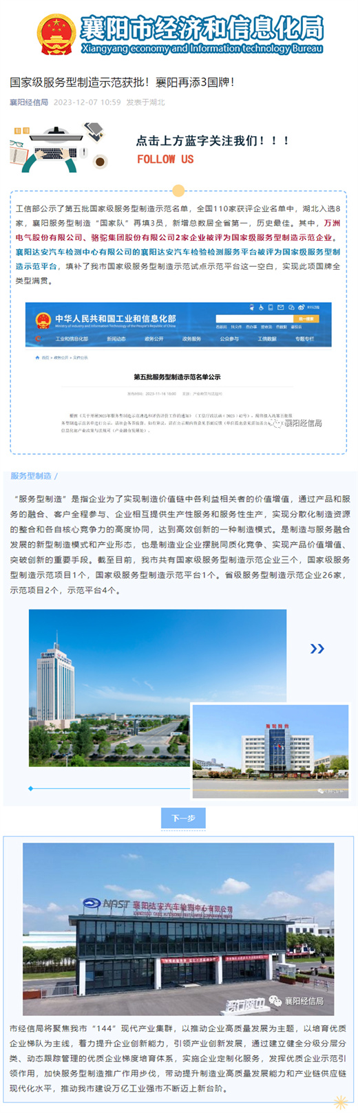 工信部公示了第五批國家級服務型制造示范名單,全國110家獲評企業(yè)名單中,湖北入選8家,襄陽服務型制造“國家隊”再填3員,新增總數(shù)居全省第一,歷史最佳。其中,萬洲電氣股份有限公司、駱駝集團股份有限公司2家企業(yè)被評為國家級服務型制造示范企業(yè)。襄陽達安汽車檢測中心有限公司的襄陽達安汽車檢驗檢測服務平臺被評為國家級服務型制造示范平臺,填補了我市國家級服務型制造示范試點示范平臺這一空白,實現(xiàn)此項國牌全類型滿貫。