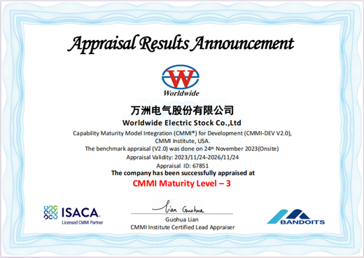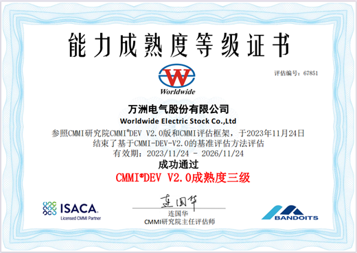 近日,萬洲電氣取得CMMI研究院頒發(fā)的CMMI3級(jí)認(rèn)證證書,標(biāo)志著萬洲電氣的軟件研發(fā)能力成熟度已達(dá)到國際水準(zhǔn)。