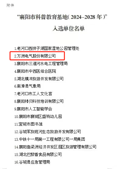 日前,從襄陽市科學技術協會獲悉,萬洲電氣成功入選襄陽市科普教育基地(2024-2028年)名單。