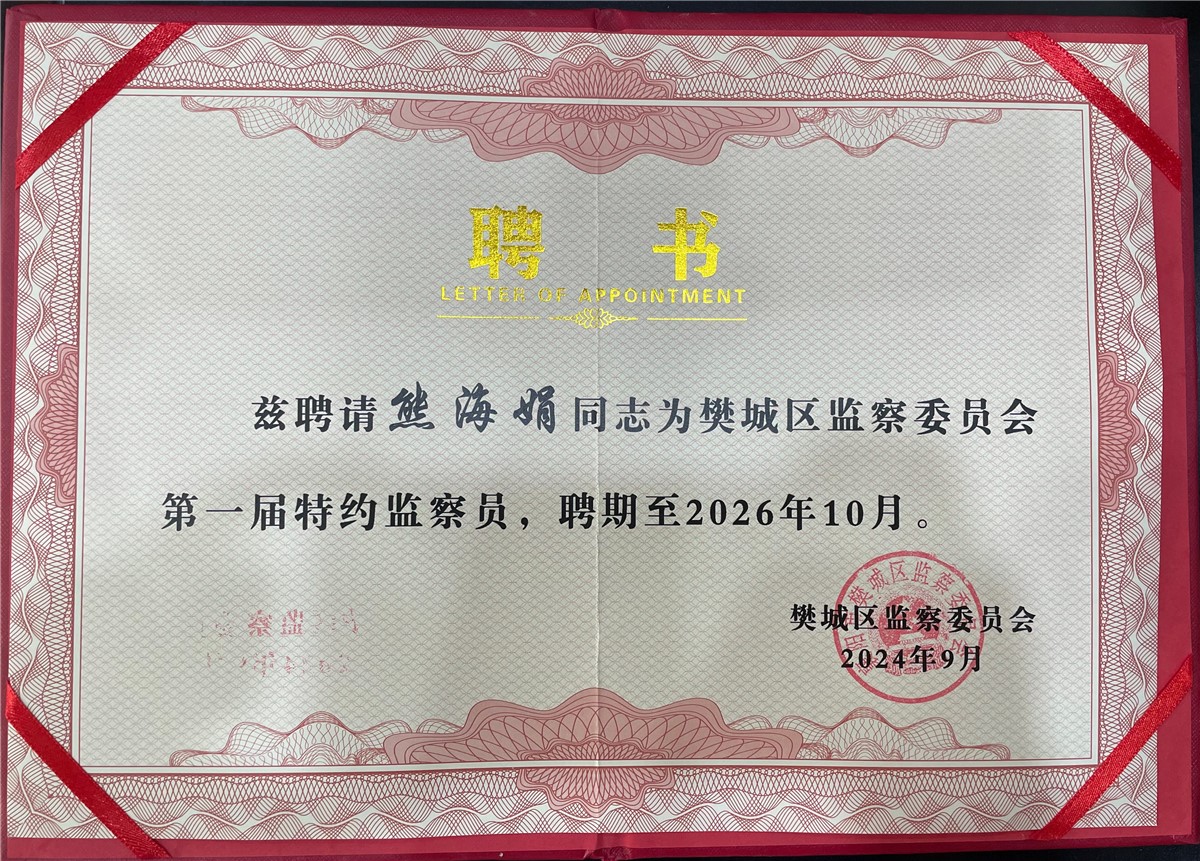 熊海娟表示,此次被聘任為特約監(jiān)察員,既是榮譽(yù),更是責(zé)任。在今后的工作中,將履職盡責(zé),用心當(dāng)好監(jiān)督員、參謀員、聯(lián)絡(luò)員和宣傳員,為樊城紀(jì)檢監(jiān)察工作貢獻(xiàn)力量!