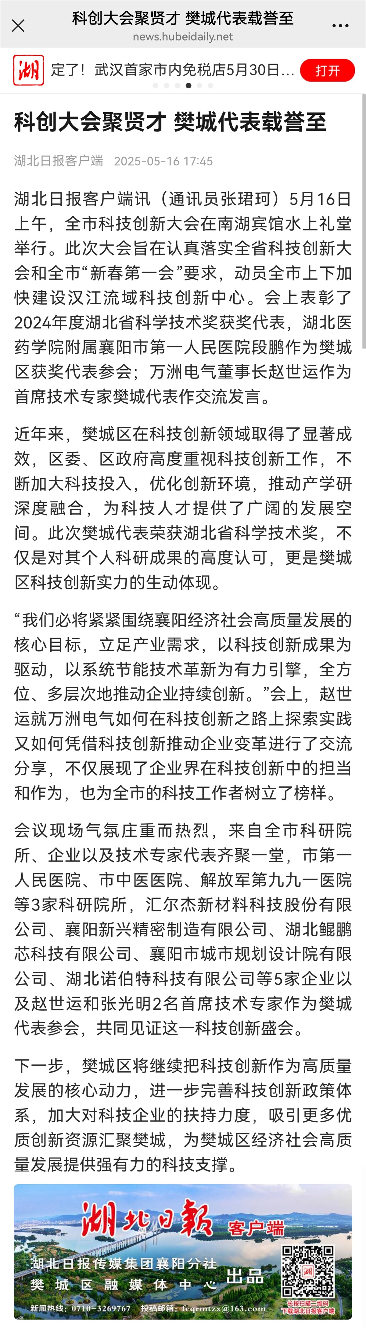 5月16日上午,全市科技創(chuàng)新大會在南湖賓館水上禮堂舉行。此次大會旨在認(rèn)真落實全省科技創(chuàng)新大會和全市“新春第一會”要求,動員全市上下加快建設(shè)漢江流域科技創(chuàng)新中心。會上表彰了2024年度湖北省科學(xué)技術(shù)獎獲獎代表,湖北醫(yī)藥學(xué)院附屬襄陽市第一人民醫(yī)院段鵬作為樊城區(qū)獲獎代表參會;萬洲電氣董事長趙世運(yùn)作為首席技術(shù)專家樊城代表作交流發(fā)言。