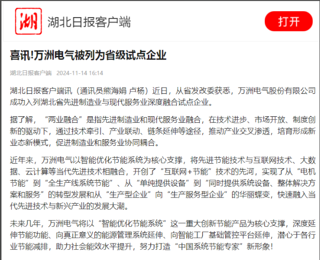 湖北日?qǐng)?bào)客戶端訊(通訊員熊海娟 盧楊)近日,從省發(fā)改委獲悉,萬(wàn)洲電氣股份有限公司成功入列湖北省先進(jìn)制造業(yè)與現(xiàn)代服務(wù)業(yè)深度融合試點(diǎn)企業(yè)。