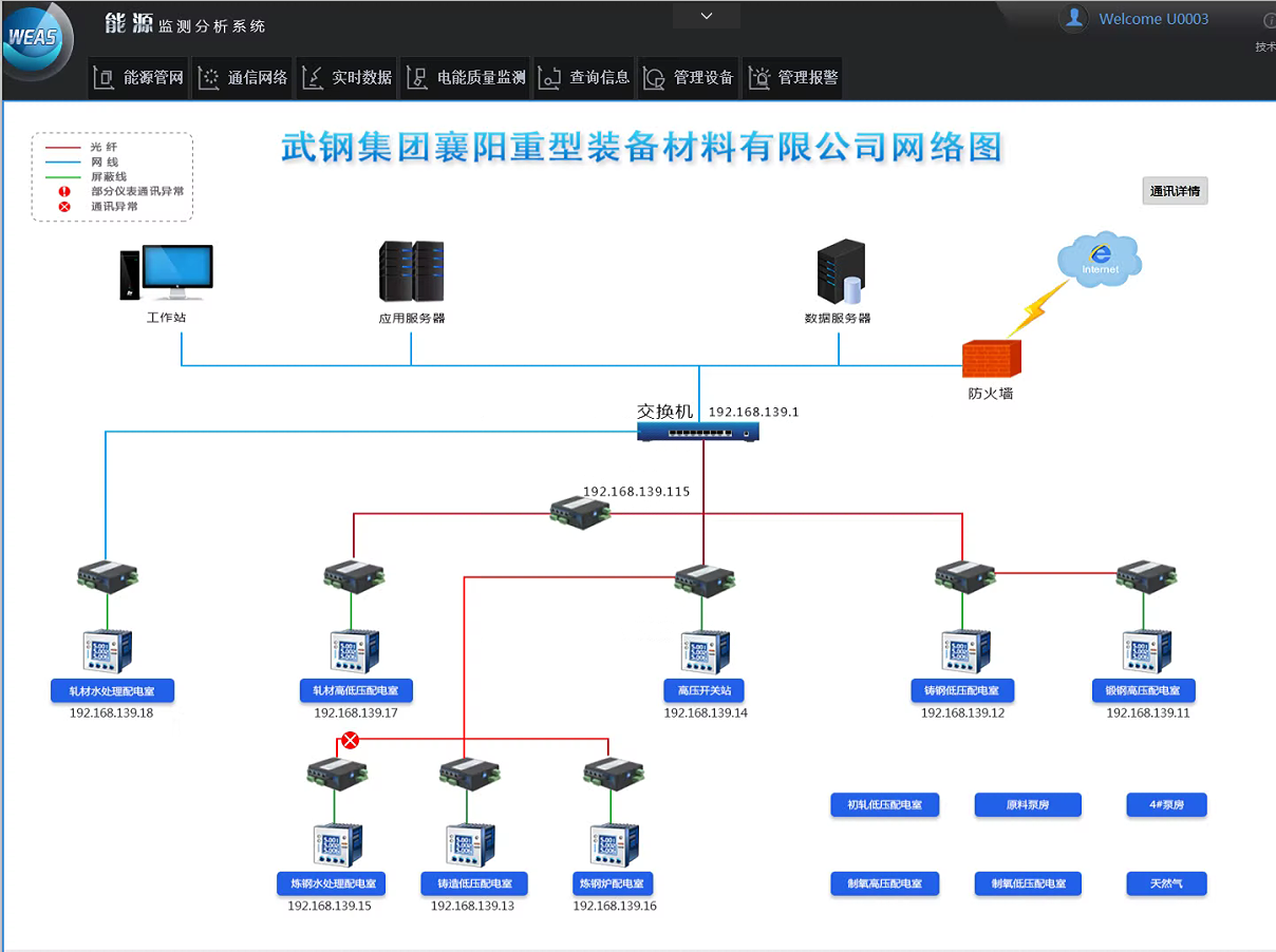 湖北某重型裝備材料有限公司WEAS能源監測分析系統監測能源種類為電力、水和天然氣,監測點共計102個,其中電力監測點86個、水系統監測點7個、天然氣監測點9個。涵蓋涵蓋煉鋼、鑄鋼、鍛鋼、軋材、制氧等區域。項目主要建設內容如下: