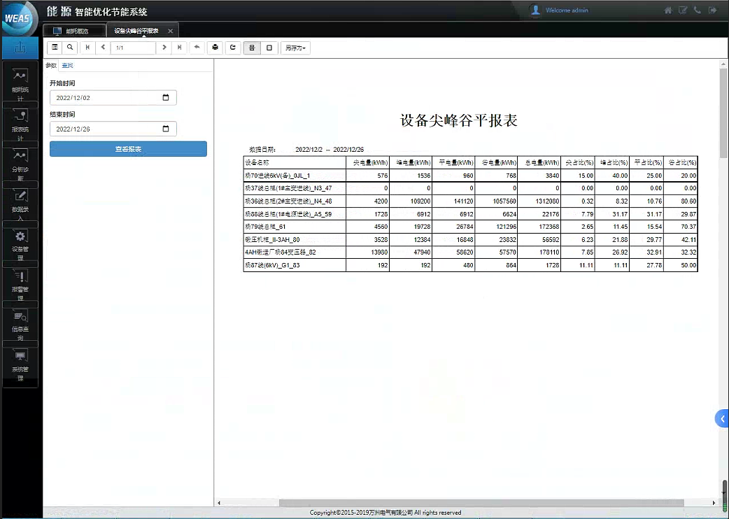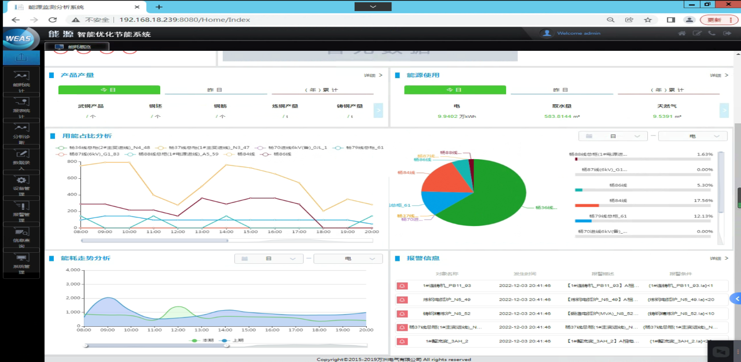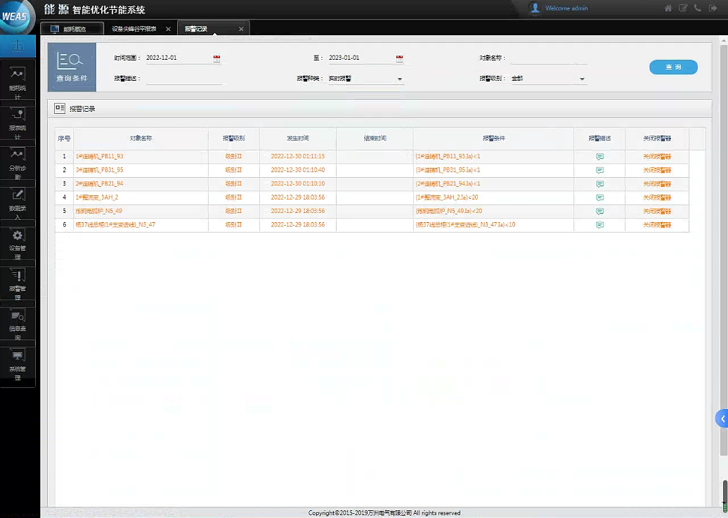 主要是對設置的報警信息進行集中管理,并針對報警信息進行匯總統計分析,分析經常出現問題的故障點、故障次數等,自動生成設備異常管理綜合報告。使用報警功能可以對重要的用能設備(連鑄機機、整流變等)設置用能參數預警,以幫助用能管理者更好的管理和維護重點用能設備,一方面控制主要用能設備的能耗,另一方面關注關鍵生產設備的運行狀態,避免設備故障造成生產的影響。