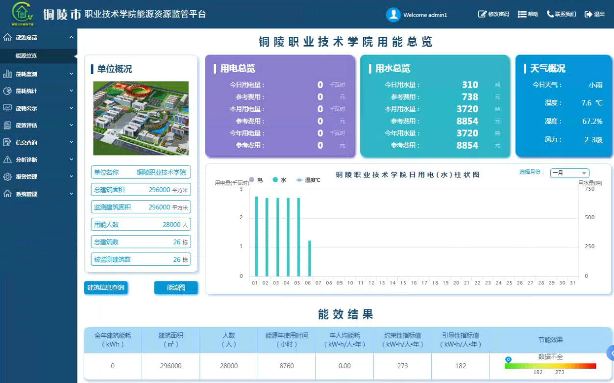 安徽某職業(yè)技術(shù)學(xué)院總建筑面積約21萬(wàn)平方米,主要建筑為6棟教學(xué)樓、14棟宿舍、實(shí)訓(xùn)樓、圖書(shū)館、食堂、大學(xué)生活動(dòng)中心等。其中圖書(shū)館地下一層為車(chē)庫(kù)。學(xué)院主要建筑均建設(shè)于2011年~2012年,維護(hù)情況較好。建筑主要能耗形式為水、電;主要用能設(shè)備為照明系統(tǒng)、各類(lèi)空調(diào)、辦公系統(tǒng)、教學(xué)設(shè)備、公共設(shè)施等。2021年2月學(xué)校部署了一套WBEAS建筑智能優(yōu)化節(jié)能系統(tǒng)。