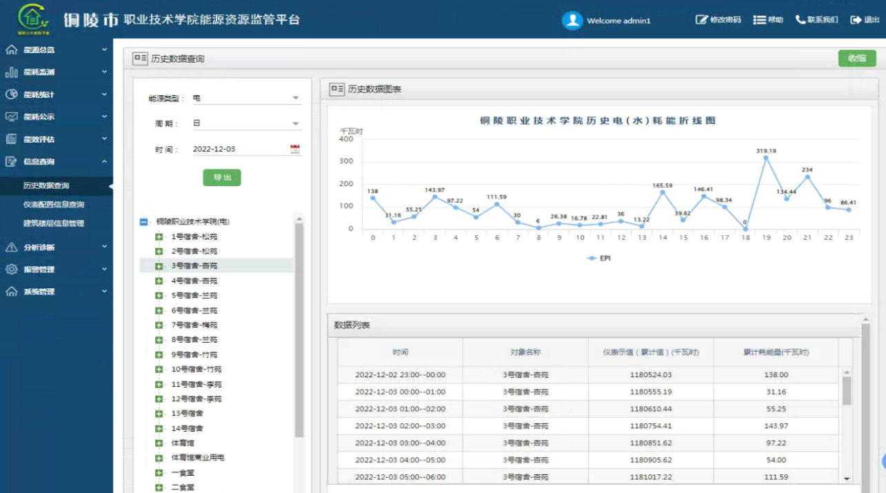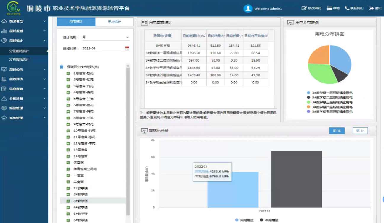 2、優(yōu)化宿舍用電管理措施,減少能源浪費(fèi)。學(xué)校宿舍樓一共有14棟,通過(guò)歷史數(shù)據(jù)查詢功能發(fā)現(xiàn)每天晚上除5號(hào)宿舍和9號(hào)宿舍在23點(diǎn)之后照明用電量有明顯的下降外,其他的宿舍樓照明用電持續(xù)運(yùn)行到凌晨1點(diǎn)才有下降的趨勢(shì),并未進(jìn)行管控,學(xué)校發(fā)現(xiàn)該問(wèn)題后,通過(guò)對(duì)宿舍樓進(jìn)行統(tǒng)一照明用電管理,優(yōu)化宿舍用電管理措施,避免能源浪費(fèi),每年學(xué)校宿舍樓節(jié)約3.29萬(wàn)元。